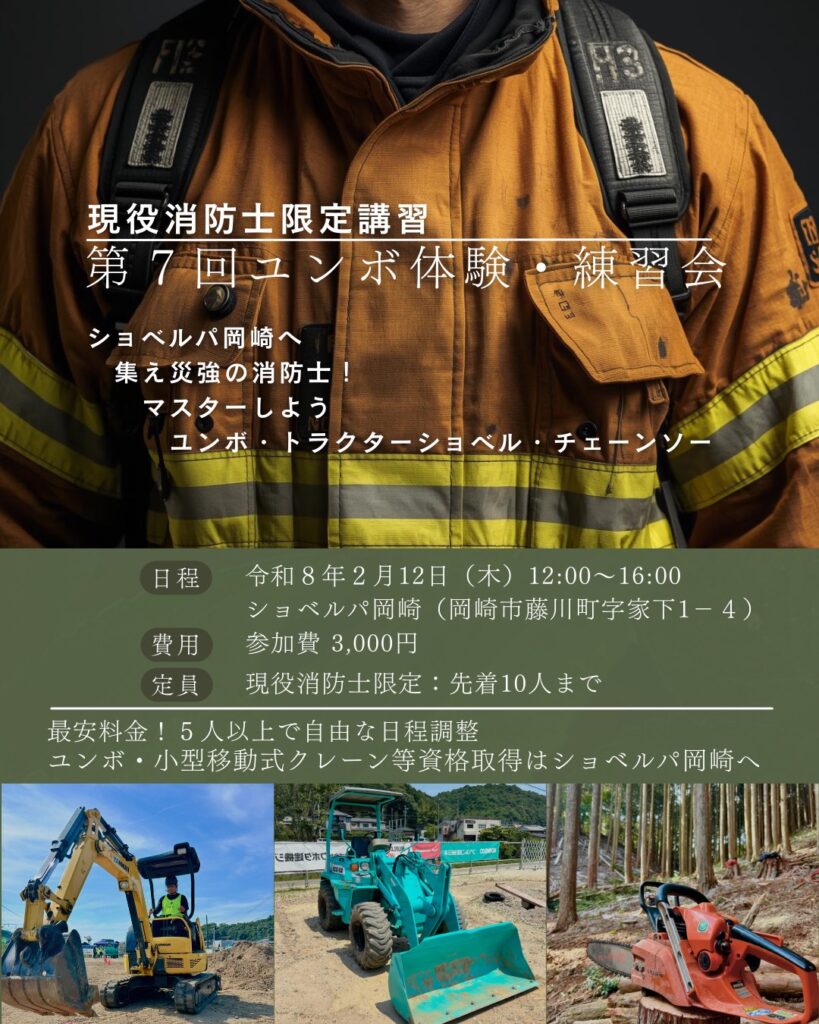 2/12(木)12:00-16:00第7回災害ボランティア講習「ユンボ体験・練習会」を開催します。
