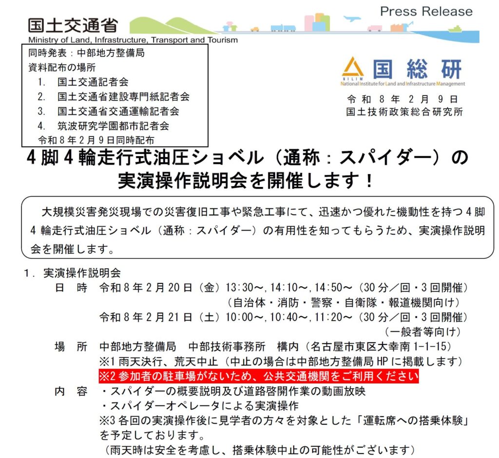 おはようございます、2/20.21名古屋市東区の中部地方整備局 中部技術事務所構内にて国総研様主催の通称:スパイダーの実演説明会へ参加させていただきます。スパイダーは能登地震の際も活躍した災害時に最前線で活躍する4脚4輪走行式油圧ショベルです。今回は国総研様のご厚意で当社ショベルパ岡崎関係者も見学させてもらうことになりました。有事の際は全国の被災地で必ず活躍するスパイダー、今後の活躍に期待です。