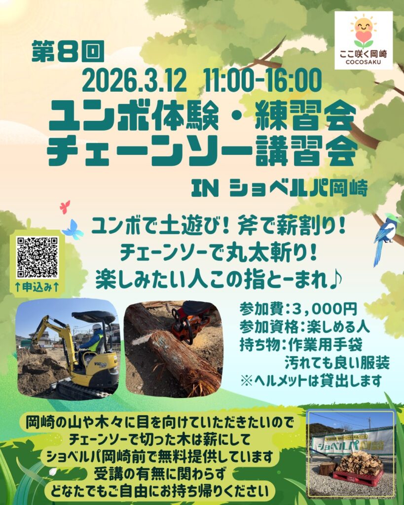 前回同様にユンボ試乗だけではなく、チェンソーを使用しての丸太切りや伐倒、ユンボを試乗しての土砂撤去など本格的な内容を楽しく行います。初心者の方、上級者の方など様々な方にご参加いただける内容となっています。完全予約制:参加費3000円税込、定員になり次第締め切りとなりますのでお早めにご予約ください。それでは皆様のご参加お待ちしております。
