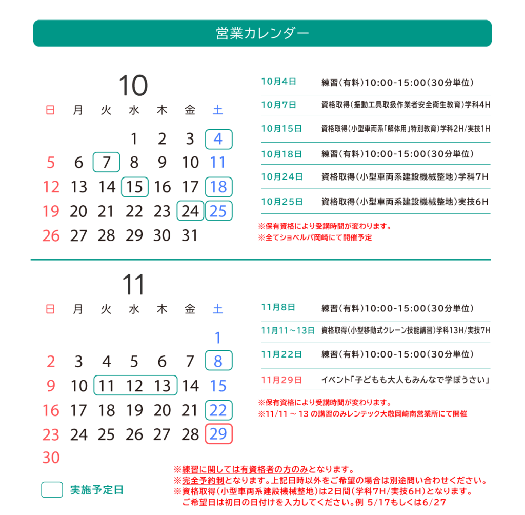ショベルパ岡崎を含む11月の講習会他をご案内致します。